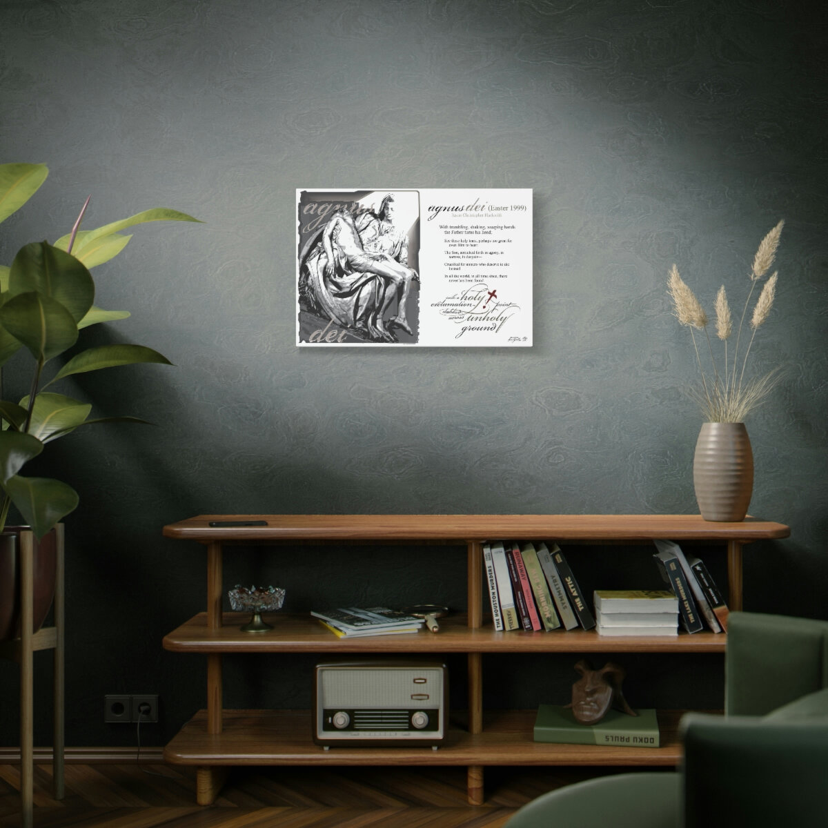 A minimalist interior setting featuring a poster with text and a black-and-white photo of an abandoned house on a wall above a cabinet. The text includes a poem titled "New Roads, Old Fears" by Jason Christopher Hackwith. A gray vase with white flowe View fullsize