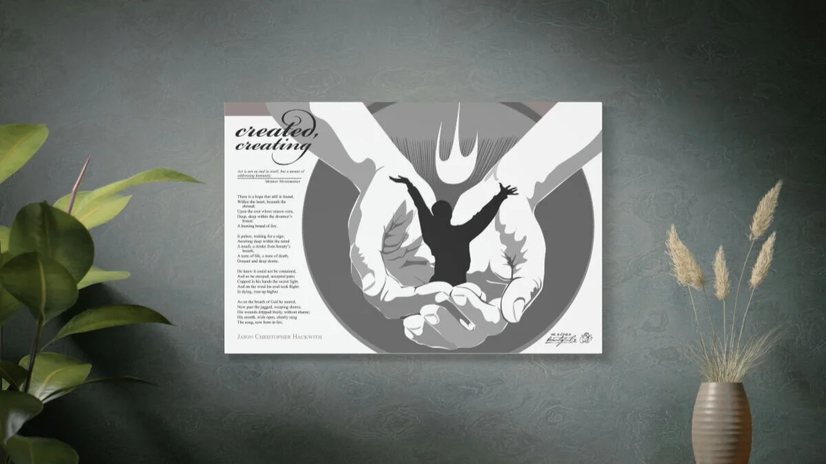 Artwork titled 'Created, Creating' by Jason Christopher Hackwith, featuring a silhouette of a person held in hands, displayed on a textured wall near a plant and pampas grass.